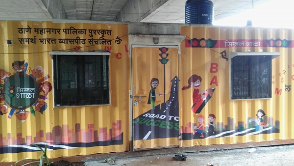 सर्वसाधारणपणे शाळा म्हटलं की गणवेशात वावरणारी मुलं, त्यांची रंगीबेरंगी दप्तरं, खेळाचं साहित्य, पुस्तकांची कपाटं, मुलांच्या अंगीच्या कलागुणांना वाव देणारं साहित्य, मोठ्ठे फळे, वेगवेगळया इयत्तांसाठी मोठ्ठाले वेगवेगळे वर्ग हेच चित्र आपल्या डोळयासमोर उभं राहतं. पण ठाण्यातली ही सिग्नल शाळा नेहमीच्या शाळांपेक्षा जरा वेगळी आहे. ठाण्यातील तीन हात नाक्यावरच्या पुलाखाली, मुंबईकडे तोंड करून उभं राहिलं की डाव्या हाताला पत्र्याचा एक मोठा कंटेनर दिसतो. या कंटेनरमध्येच रोज सिग्नल शाळा भरते. कंटेनरचा दरवाजा उघडून आत गेलं की वेगवेगळया वयोगटाची मुलं एकत्र अभ्यास करताना दिसतात.