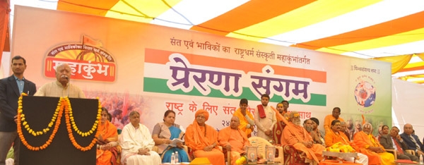 या महाकुंभात प्रेरणा संगम हा कार्यक्रम आयोजित करण्यात आला होता. त्यात भारतीय सेना व वीर शहीदांच्या कुटुंबीयांचा सत्कार आयोजित करण्यात आला होता. या वेळी शंकराचार्य जगद्गुरू वासुदेवानंद सरस्वती, योगी आदित्यनाथ, जनरल निर्मलचंद्र विज, पुण्याचे एअर मार्शल भूषण गोखले, कर्नल सुनील देशपांडे प्रभृती व्यासपीठावर होते. लेफ्टनंट जनरल सैय्यद अताहस बैन व गुजरातचे माजी पोलिस अधिकारी ए.जी. वंजारा या वेळी प्रेक्षकांमध्ये उपस्थित होते. या कार्यक्रमादरम्यान 150 वीरपत्नी व मातांचा मान्यवरांच्या हस्ते सत्कार करण्यात आला. या कार्यक्रमाच्या प्रारंभी तीन रुग्णवाहिकांचे लोकार्पण करण्यात आले. या रुग्णवाहिका विस्थापित काश्मिरी पंडितांच्या सेवेसाठी वापरल्या जाणार आहेत. या वेळी बोलताना सरसंघचालक डॉ. मोहन भागवत म्हणाले, ''प्रपंचात आपण देवाचे नाव घेतो, तेव्हाच सर्व काही सुरळीत चालते ना? मग त्याच धर्तीवर सैनिकांचे स्मरणही सदैव ठेवायला हवे. सैनिकांप्रती कृतज्ञता व्यक्त करण्यासाठी केवळ युध्दाची वेळच यायला हवी असे जरुरी नाही, तर ते स्मरण नित्यनेमाने आणि हृदयापासून करा. साध्या शब्दांत सांगायचे झाले तर जीवन जगताना देवभक्ती व देशभक्ती समान ठेवायला हवी.