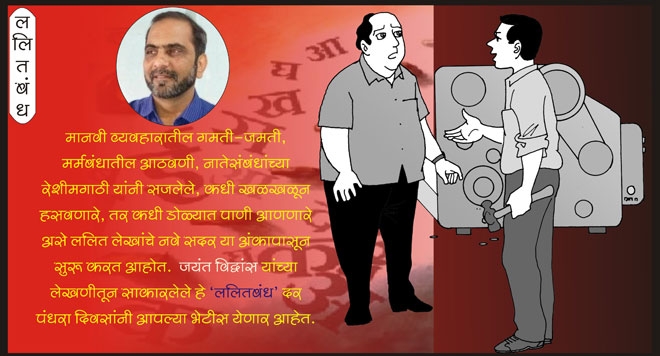 मानवी व्यवहारातील गमती-जमती, मर्मबंधातील आठवणी, नातेसंबंधांच्या रेशीमगाठी यांनी सजलेले, कधी खळखळून हसवणारे, तर कधी डोळयात पाणी आणणारे असे ललित लेखांचे नवे सदर या अंकापासून सुरू करत आहोत.  जयंत विद्वांस यांच्या लेखणीतून साकारलेले हे 'ललितबंध' दर पंधरा दिवसांनी आपल्या भेटीस येणार आहेत.
