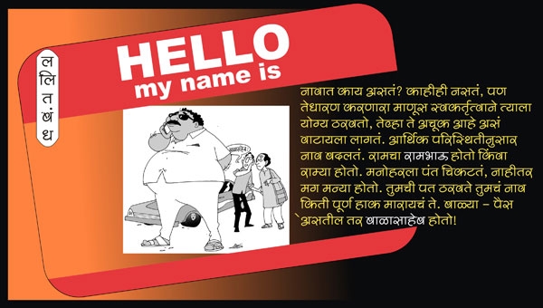 'What's in a name?' अर्थात 'नावात काय असतं?' असं विल्यमपंत त्यांच्या 'रोमिओ-ज्युलिएट' नाटकामध्ये म्हणून गेलेत. एकूणच पुण्यात राहणारी माणसं (राहणारी म्हणजे जन्माला आल्यापासून राहणारी. बाहेरून आलेले रेफ्युजी यात मोडत नाहीत), दुसऱ्याचं विधान जगप्रसिध्द असलं तरी त्याला तोडीस तोड काही सापडतंय का बघतात किंवा त्याला निरुत्तर करणारं काहीतरी शोधतात. आनंदीबाईंचा वारसा सांगत मी फक्त 'अ'चा 'न' केला आणि प्रतिप्रश्न तयार. विल्यमराव, नावात काय नसतं? गमतीचा भाग सोडून देऊ, पण जन्माला आल्यावर सगळयात मोठं कार्य काय? तर नाव शोधणं. लगेच शोधमोहीम चालू होते. आधी अभिमन्यू अवस्थेत असताना आपल्या कानावर चर्चा पडत असाव्यात, पण नंतर लक्षात राहत नाहीत, एवढंच. जन्माला आल्यापासून आपण परस्वाधीन असतो. आपल्याला काय हाक मारली तर आवडेल? या प्रश्नाचं उत्तर देण्याएवढी अक्कल आल्यावर खरं तर नाव ठेवायला हवं. पूर्वजांचं किंवा मागच्या पिढीच्या कुणाचं नाव चिकटवून आठवण तेवती ठेवणं हे सगळयात सोपं काम.