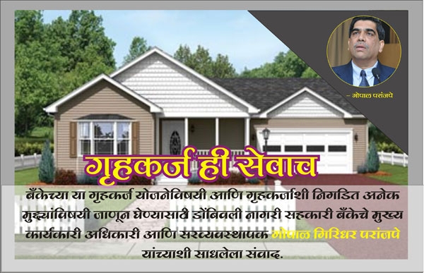 आपल्या हक्काच्या घराचे स्वप्न पूर्ण करण्यात गृहकर्जाचा वाटा मोलाचा असतो. विश्वासार्हता आणि व्याजदर या दोन्ही बाबतीत सर्वसामान्य ग्राहक गृहकर्जासाठी सहकारी बँकांना पसंती देतात. डोंबिवली नागरी सहकारी बँक 47 वर्षांपासून सहकार क्षेत्रात कार्यरत आहे. सर्वसामान्य माणसाच्या जवळची बँक ही तिची ओळख. याच सर्वसामान्य माणसाचे घराचे स्वप्न प्रत्यक्षात साकारण्यासाठी बँकेने 'गृहलक्ष्मी' योजनेसारखी आकर्षक आणि कमी व्याजदर असलेली गृहकर्ज योजना आणली. बँकेच्या या गृहकर्ज योजनेविषयी आणि गृहकर्जाशी निगडित अनेक मुद्दयांविषयी जाणून घेण्यासाठी डोंबिवली नागरी सहकारी बँकेचे मुख्य कार्यकारी अधिकारी आणि सरव्यवस्थापक गोपाळ गिरिधर परांजपे यांच्याशी साधलेला संवाद.