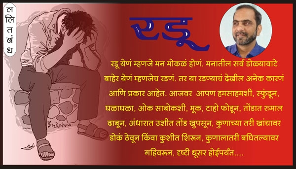 रडू येणं म्हणजे मन मोकळं होणं. मनातील सर्व डोळयावाटे बाहेर येणं म्हणजेच रडणं. तर या रडण्याचंदेखील अनेक कारणं आणि प्रकार आहेत. आजवर आपण हमसाहमशी, स्फुंदून, घळाघळा, ओकसाबोकशी, मूक, टाहो फोडून, तोंडात रुमाल दाबून, अंधारात उशीत तोंड खुपसून, कुणाच्या तरी खांद्यावर डोकं ठेवून किंवा कुशीत शिरून, कुणालातरी बघितल्यावर गहिवरून, दृष्टी धूसर होईपर्यंत....