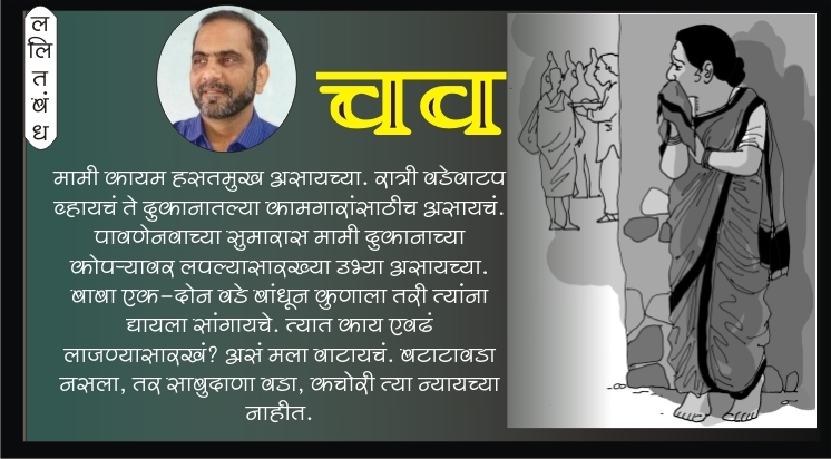 दुकानात निवडलेलं धान्यं विकायला असायचं. मामी घरी पोती न्यायच्या निवडायला. सगळे मिळून दिवसाला शंभरचं पोतं करायचेच. मामा सतत आजारी. मुली नोकरी करायच्या. किती पैसा मिळणार! पण मामी कायम हसतमुख असायच्या. रात्री वडेवाटप व्हायचं ते दुकानातल्या कामगारांसाठीच असायचं. पावणेनवाच्या सुमारास मामी दुकानाच्या कोपऱ्यावर लपल्यासारख्या उभ्या असायच्या. बाबा एक-दोन वडे बांधून कुणाला तरी त्यांना द्यायला सांगायचे. त्यात काय एवढं लाजण्यासारखं? असं मला वाटायचं. बटाटावडा नसला, तर साबुदाणा वडा, कचोरी त्या न्यायच्या नाहीत. मला जाम उत्सुकता या प्रकाराची.