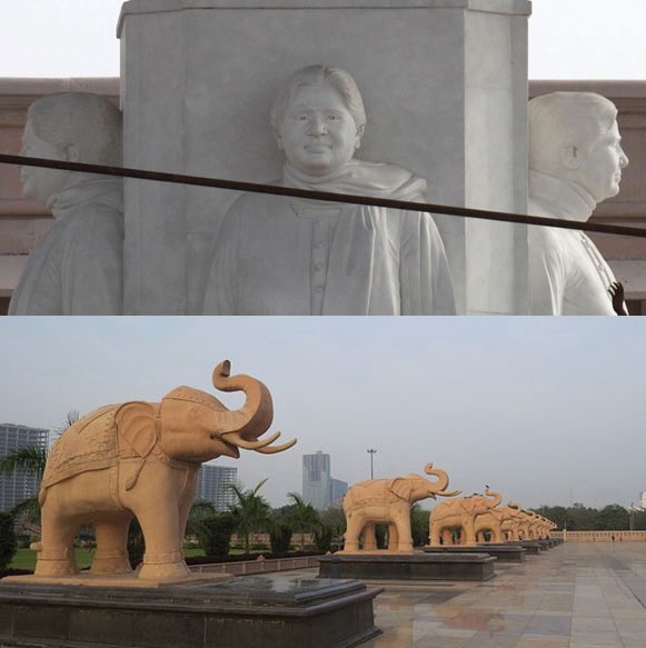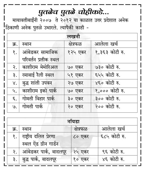 मायावती ह्या उत्तर प्रदेशाच्या चार वेळा मुख्यमंत्री झाल्या. पहिल्या तीन वेळा त्यांची कारकिर्द जेमतेम वर्षभर टिकली. मात्र सन 2007मध्ये झालेल्या निवडणुकीत त्यांच्या पक्षाला घवघवीत यश मिळालं. अगदी दोन तृतीयांश बहुमत. मग मायावतीबाईंनी मागे वळून पाहिलंच नाही. त्या अगदी सुसाट निघाल्या. त्यांना पुतळयांचं भारी वेड. त्यामुळे गौतम बुध्द, डॉ. आंबेडकर यांचे पुतळे त्यांनी उभारले, तर ते आपण समजू शकतो. काशीराम यांचा पुतळा उभारणंही तर्काला धरून आहे. पण जिवंत असताना, स्वत:चाच पुतळा (नव्हे, असंख्य पुतळे) उभारण्याचं अफलातून काम मायावतींनी केलंय.