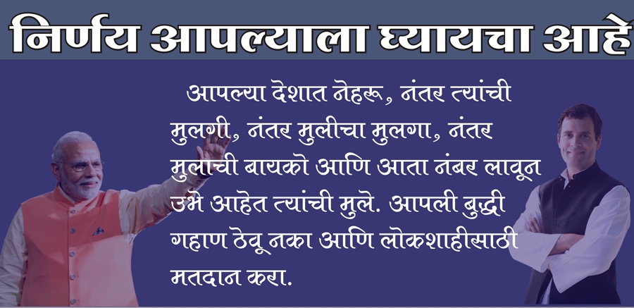 कालांतराने हा पक्ष एका घराण्याचा पक्ष झाला. या घराण्याचे नाव आहे - नेहरू-गांधी घराणे. या घराण्यात जन्मलेला हेच समजतो की, मी पंतप्रधान होण्यासाठी जन्मलेलो आहे आणि देश मीच चालविणार आहे. तो दुसऱ्या कुणाला काही किंमत देत नाही. मनमोहन सिंग दहा वर्षे पंतप्रधान होते. त्यांचा कसा चोथा केला, हे समजण्यासाठी 'द ऍक्सिडेंटल प्राइममिनिस्टर' हे पुस्तक वाचले पाहिजे किंवा चित्रपट बघितला पाहिजे. राहुल गांधी सतत देशभर कशी बेताल बडबड करीत फिरत असतात, हे आपण रोज ऐकतो किंवा वाचतो. आपल्याला निर्णय घ्यायचा आहे की, आम्हाला लोकशाही हवी की घराणेशाही?