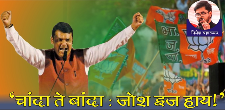 धरमपेठ, नागपूर ते मलबार हिल, मुंबई असा प्रवास अल्पावधीत करणाऱ्या मुख्यमंत्री फडणवीस यांचं राज्याच्या राजकारणातील स्थान विश्वास बसणार नाही अशा गतीने मजबूत झालं आहे आणि आगामी निवडणूक ही या राज्यव्यापी नेतृत्वावर पुन्हा एकदा ठसठशीत शिक्कामोर्तब करण्याची संधी असेल. लोकसभा निवडणुकीत भाजपाने मिळवलेला विजय हा सर्वच विरोधी पक्षांच्या तोंडचं पाणी पळवणारा ठरला असून स्वबळावर तब्बल तीनशे जागांचा टप्पा पक्षाने ओलांडल्याने पंतप्रधान नरेंद्र मोदी यांच्या नेतृत्वाखाली आपल्या पक्षाला काहीच अशक्य नाही, हा आत्मविश्वास पक्षामध्ये निर्माण झाला आहे. देशभरातील या स्थितीप्रमाणेच राज्यातही अशीच परिस्थिती असून निवडणूक काही दिवसांवर येऊन ठेपली असताना भाजपाच्या शीर्षस्थ नेतृत्वापासून ते तळातील सर्वसामान्य कार्यकर्त्यांपर्यंत सगळीकडेच 'जोश इज व्हेरी हाय' हे चित्र ठळकपणे जाणवत आहे.