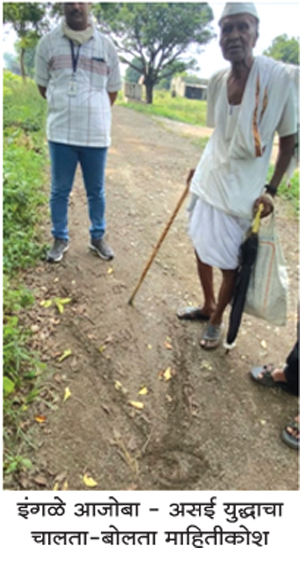 7 ऑक्टोबर 2021ला सासमकर यांच्यासह मी, कैलास राठोड आणि सुहास आजगावकर असईला गेलो, तेव्हाही मुख्य गावाला नेणारा रस्ता बंद होता, कारण गावाशेजारून वाहणारी जुई नदी दुथडी भरून वाहत होती व त्यावरचा छोटा पूल पाण्याखाली होता. शेवटी शेतांतून दीड किलोमीटर वाट काढत व एका बांधार्याच्या भिंतीवरून नदी ओलांडत कसेबसे आम्ही युद्धभूमी स्मारकापर्यंत पोहोचलो. या काळात अशी स्थिती, तर 1803मध्ये काय परिस्थितीत आपले पूर्वज लढले असतील, याची कल्पना करता येते! आम्ही पॅट्रिकच्या थडग्याजवळ उभे होतो, तेव्हा तिथल्या शेतात घर असलेले एक आजोबा आम्हाला भेटले. कोपरी, धोतर अशा वेशातील 88 वर्षांचे इंगळे हे स्थानिक ज्येष्ठ नागरिक निवृत्त शिक्षक आहेत. अत्यंत खणखणीत शब्दांत व बारीकसारीक तपशिलासह त्यांनी या लढाईची माहिती दिली. हातातल्या काठीने जमिनीवर नकाशा काढून दाखवत लढाईत महत्त्वाचे मोर्चे कुठे व कसे होते याचे अगदी जिवंत वर्णन केले. इंगळे आजोबांसारखा चालता-बोलता माहितीकोश आवतीभोवती असताना या लढाईच्या महितीसाठी आपल्याला विकिपीडियाचा आधार घ्यावा लागतो. मराठवाड्यात इतिहासाच्या अशा अनेक पाऊलखुणा आहेत, पण कधी इतिहासाच्या पुस्तकांतून सर्वसामान्यांपर्यंत ही सगळी माहिती जात नाही. शिवशंभू विचार दर्शनने आता युवकांना सोशल मीडियाद्वारे याबद्दलची माहिती देण्याचे प्रयत्न सुरू केले आहेत. ‘भविष्य स्वत: घडवायचे असेल तर इतिहासाचा अभ्यास करा’ असे कन्फ्युशियस सांगून गेला. भोकरदनसारख्या छोट्या शहरात राहून आपला इतिहास, त्यातल्या वीरांची गाथा पुढच्या पिढीपर्यंत नेण्याची रवींद्र सासमकरांसारख्या युवा कार्यकर्त्यांची धडपड या दृष्टीने फार मोलाची आहे.