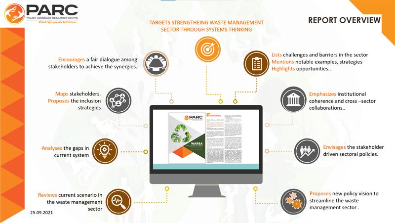 रिपोर्ट लिंकर आणि मोर्डर इंटेलिजन्स या संस्थांच्या अहवालामध्ये भारतातील घन कचरा व्यवस्थापनाचे मार्केट 2025पर्यंत 1500 कोटी डॉलर्सचे असणार असल्याचा दावा करून मार्केटच्या वाढीचा वेग (CAGR) 7.14% असेल, असे भाकीत वर्तवले आहे. असे असले, तरी अद्याप हे मार्केट सुप्तावस्थेत आहे. परंतु जर सर्व दृष्टींनी विचार करून घन कचरा व्यवस्थापन मार्केटच्या वाढीस चालना दिली, तर आपल्या बर्याच पर्यावरणविषयक समस्यांना उत्तरे मिळतील. याच दृष्टीकोनातून पॉलिसी अॅडव्होकसी रिसर्च सेंटर (PARC) या संस्थेने 25 सप्टेंबर 2021 रोजी ऑनलाइन माध्यमातून घन कचरा व्यवस्थापन या विषयासंदर्भात ‘ "WARSA (वारसा) - Waste As Resource by Changing Stakeholders' Approach' नावाचा शोधनिबंध प्रकाशित केला.