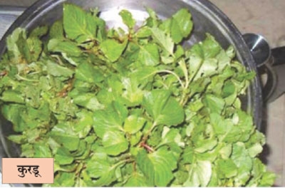 कुरडूची पाने खुडून, धुऊन (तीन ते चार वेळा पाण्यात धुवावीत), 2 कांदे बारीक चिरून, 4-5 लसूण पाकळ्या ठेचून, 2-3 मिरच्या चिरून, पाव चमचा हिंग, अर्धा चमचा हळद, 1 टमाटा बारीक चिरून, पाव वाटी ओले खोबरे, चवीपुरते मीठ, अर्धा चमचा साखर,