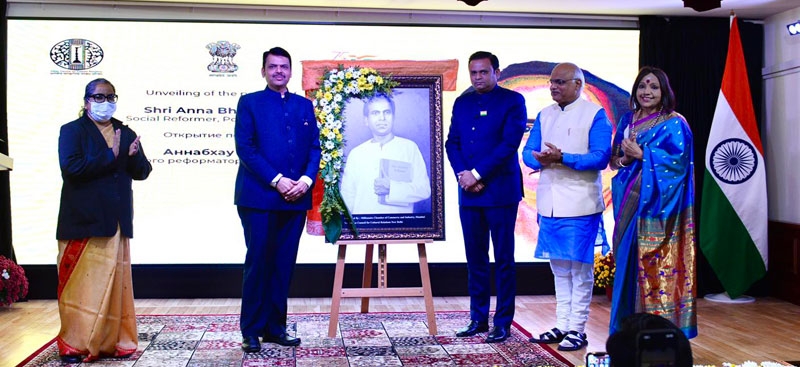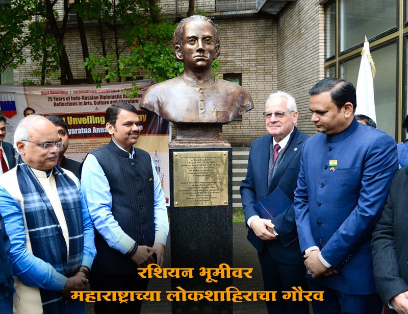 पॉवेल कुझमिन, देवेंद्र फडणवीस, राहुल नार्वेकरजी या मान्यवरांच्या हस्ते अण्णा भाऊ साठे यांच्या अर्धपुतळ्याचे अनावरण करण्यात आले.