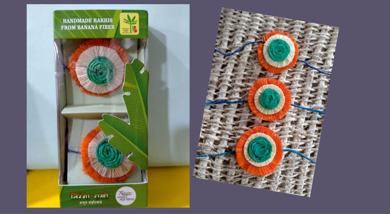 या भागात केळीचे उप्तादन मोठ्या प्रमाणावर होते. केळी विकली जातात, पण केळीच्या खांबांचे करायचे काय? त्याची विल्हेवाट कशी लावायची? हा व्यापार्यांसमोरील प्रश्न होताच. बांबूपासून वस्तू बनू शकतात, मग केळीच्या सोपापासून का नाही? असा विचार झाला आणि केळीच्या सोपापासून वस्तू बनू लागल्या. केळीचे खांब हे आपल्याकडे शुभ मानले जातात. हिंदू संस्कृतीत मंगल प्रसंगी ते वापरले जातात. त्यामुळे ‘मंगल फायबर’ असे या उत्पादनाचे नामकरण करण्यात आले. सुरुवातीला यापासून पुरुषांसाठी पाकीट, महिलांसाठी आकर्षक पर्स बनविल्या गेल्या. 2021मध्ये केळीच्या सोपापासून पहिल्यांदा राखी बनविण्यात आली. या सर्व राख्या पर्यावरणस्नेही असतात. या राख्या पूर्ण करण्यासाठी 5 गावांतील 35 महिला काम करत होत्या.