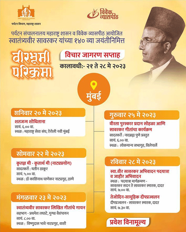स्वा. सावरकरांचे वास्तव्य लाभलेल्या महाराष्ट्रातील ठिकाणांचे जसे की भगूर [सावरकरांचे जन्मस्थान], नाशिक, पुणे, सांगली, रत्नागिरी व मुंबई येथील ऐतिहासिक स्थळांचा विकास करत 'स्वा. सावरकर टुरिझम सर्किट' निर्मितीचा संकल्प राज्याचे पर्यटनमंत्री मंगलप्रभात लोढा यांनी नुकताच घोषित केला होता. तसेच, या सर्किटला 'वीरभूमी परिक्रमा' असे नावही देण्यात आले होते. यासह सावरकरांच्या जीवनकार्याला अधिकाधिक जनतेपर्यंत पोहोचवण्याकरिता पर्यटन विभाग व विवेक व्यासपीठाच्या माध्यमातून 'विचार जागरण सप्ताहा'चे आयोजन करण्यात आले. याअंतर्गत दि. २१ मे ते २८ मे दरम्यान येथे उल्लेखलेल्या सर्व ठिकाणी मिळून तब्बल ४० हून अधिक कार्यक्रम संपन्न होत असून त्यांना प्रचंड प्रमाणात प्रतिसाद मिळत आहे.