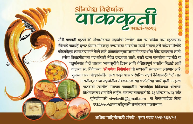 ‘सणासुदीचे दिवस आणि वैशिष्ट्यपूर्ण भारतीय मिठाई’ अशी यंदाच्या सा. विवेकच्या ‘श्रीगणेश विशेषांका’ची मध्यवर्ती संकल्पना असणार आहे. तुमच्या घरात असे काही खास पारंपरिक पदार्थ (मोदक सोडून) नैवेद्यासाठी केले जात असतील, तर त्या पदार्थातील पोषक घटकांसह व फोटोंसह त्याची कृती आम्हाला पाठवावी. त्यातील निवडक पाककृतींना साप्ताहिक विवेकच्या श्रीगणेश विशेषांकात स्थान दिले जाईल. आपल्या पाककृती दि. 13 ऑगस्ट 2023पर्यंत युनिकोडमध्ये vivekedit@gmail.com या मेलआयडीवर किंवा 9967570531 या व्हॉट्सअ‍ॅप क्रमांकावर पाठवाव्यात.