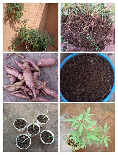पुढच्या दारात हौसेने पारिजातक लावला व जाईचा वेल, दोन प्रकारची जास्वंद, शेवंती, सोनचाफा, तुळस, अबोली लावली. घराच्या मागच्या भागात नारळ, पपई, कढीपत्ता, जास्वंद, तगर, डबल तगर इ. झाडे लावली. मधील मोकळ्या जागेत आळू, आले, वांगे, मिरची, पालक, दोडक्याचा, कारल्याचा वेल लावला. नवीनच झाडे लावल्याने व ऊन पण भरपूर असल्याने फुले व भाज्या छान यायला लागल्या.
