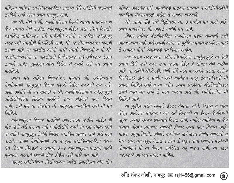 डॉ. हेडगेवारांच्या अनुपस्थितीत झालेले कार्यक्रम विशेष यशदायी व भव्य स्वरूपात घडून आले, त्याविषयी डॉक्टरांनी आपले मनोगत कसे व्यक्त केले? ओटीसी (संघ शिक्षा वर्गाचे) पूर्व परिपूर्ण नियोजन... या पत्रातून समजून घेऊ या...