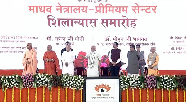 माधव नेत्रालयाचा कार्यक्रम दहा वाजता होता. बरोबर 9 नऊ वाजून 59 मिनिटांनी पंतप्रधान नरेंद्र मोदी, डॉ. मोहन भागवत, केंद्रीय मंत्री नितीन गडकरी, महाराष्ट्राचे मुख्यमंत्री देवेंद्र फडणवीस, स्वामी गोविंद देव गिरी महाराज व स्वामी अवधेशानंद गिरी महाराज व्यासपीठावर पोहोचले. एवढे सगळेजण व्यासपीठावर असताना यापैकी कोण आधी बोलणार व कोण नंतर याचे कुतूहल होते. सुरुवातीला माधव नेत्रालयाचे सचिव डॉ. अविनाश चंद्र अग्निहोत्री यांनी प्रास्ताविक केले तर उपाध्यक्ष निखिल मुंडले यांनी सर्वांचे स्वागत केले. शरद अग्निहोत्री लिखित पुस्तकाचे विमोचन झाले.