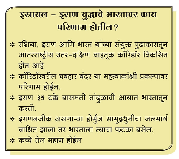 भारताच्या दृष्टीने इराण आणि इस्रायल ही दोन्ही मित्रराष्ट्र आहेतच; पण त्या दोन्ही राष्ट्रांशी भारताचा व्यापारही मोठ्या प्रमाणावर आहे. गेल्या आर्थिक वर्षात भारताने इराणला सव्वा अब्ज डॉलरची निर्यात केली होती तर आयात 44 कोटी डॉलरची होती. इस्रायलच्या बाबतीत हे प्रमाण अनुक्रमे दोन अब्ज डॉलर आणि दीड अब्ज डॉलर इतके आहे. इराण जेवढ्या बासमती तांदुळाची आयात करतो त्यापैकी 35 टक्के बासमती तांदुळाची आयात भारतातून करतो. हे एक उदाहरण. भारताच्या दृष्टीने या दोन्ही राष्ट्रांशी व्यापारतूट नसली तरी संघर्ष चिघळला तर व्यापारावर प्रतिकूल परिणाम होत असतोच. त्यातच इराणनजीक असणार्‍या होर्मुज सामुद्रधुनीचा जलमार्ग बाधित झाला तर भारताला त्याचा फटका बसेल. भारत जेवढ्या कच्च्या तेलाची आयात करतो त्यापैकी 60 टक्के तेल या मार्गाने येते; तर नैसर्गिक वायूच्या आयातीपैकी निम्मा पुरवठा या मार्गाने होतो. तेव्हा हा जलमार्ग बाधित होणे भारताच्या अर्थव्यवस्थेवर ताण आणणारे ठरेल. आताच कच्च्या तेलाच्या किंमतीच्या ब्रेंट निर्देशांकाने सात टक्क्यांची उसळी घेतली आहे. कच्चे तेल महागले तर केवळ इंधन महाग होते असे नाही तर रंगांसाठी आवश्यक द्रव्यापासून अनेक रसायने महाग होतात. त्याबरोबरच व्यूहनीतीच्या दृष्टीने कळीचा मुद्दा म्हणजे चाबहार बंदराचे भवितव्य काय हा. इराण आणि भारताच्या संयुक्त गुंतवणुकीतून हे बंदर विकसित होत आहे. रशिया, इराण आणि भारत यांच्या संयुक्त पुढाकारातून आंतरराष्ट्रीय उत्तर-दक्षिण वाहतूक कॉरिडॉर विकसित होत आहे, जे भारतीय उपसागर आणि पर्शियन आखाताला जोडणार आहे. त्याच कॉरिडॉरवरील चबहार बंदर हा महत्त्वाकांक्षी प्रकल्प. याचे कारण त्यामुळे भारत थेट अफगाणिस्तान, मध्य आशिया आणि युरोपशी जोडला जाईल. सुवेझ कालव्याला पर्याय म्हणून असणार्‍या या जलमार्गाबरोबरच चाबहार बंदराचे व्यूहात्मक महत्त्व म्हणजे चीनच्या मदतीने पाकिस्तानमध्ये विकसित करण्यात आलेल्या ग्वादर बंदराला शह देण्याची आणि चीनचा प्रादेशिक प्रभाव कमी करण्याची क्षमता चाबहार बंदरात आहे. इस्रायल-इराण संघर्षात पश्चिम आशियाचा भूगोल आणि इतिहास बदलला जाण्याची शक्यता नाकारता येत नाही. अशा स्थितीत चाबहार बंदराचे भवितव्य काय हाही प्रश्न अस्थानी नाही. तेव्हा इस्रायल-इराण हे दोन्ही मित्र असले तरी त्यांच्यामधील संघर्ष भारतासमोर समस्या निर्माण करू शकतो.