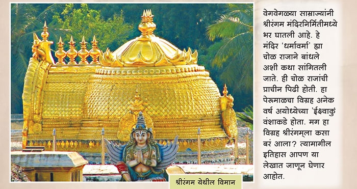 वेगवेगळ्या साम्राज्यांनी श्रीरंगम मंदिरनिर्मितीमध्ये भर घातली आहे. हे मंदिर ‘धर्मावर्मा’ ह्या चोळ राजाने बांधले अशी कथा सांगितली जाते. ही चोळ राजांची प्राचीन पिढी होती. हा पेरूमाळचा विग्रह अनेक वर्ष अयोध्येच्या ’ईक्ष्वाकु’ वंशाकडे होता. मग हा विग्रह श्रीरंगम्ला कसा बरं आला? त्यामागील इतिहास आपण या लेखात जाणून घेणार आहोत.