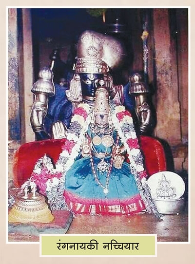 श्रीरंगनाथाच्या मंदिरात असंख्य मूर्ती व त्यांच्या उत्सवमूर्ती आहेत. आमच्या पहिल्या भेटीत नम्म पेरुमाळचे दर्शन झाले तरी मूलवरमचे दर्शन न झाल्याने मन खट्टू झाले होते. हीच ओढ मला परत मंदिरात घेऊन आली. माझ्या दुसर्‍या भेटीत मंदिरात प्रवेश केल्यावर एक वेगळाच उत्साह माझ्या मनी दाटून आला. गर्दीतून वाट काढत जशी मी गर्भगृहाजवळ पोहोचले तसं मला शयन अवस्थेतील श्रीरंगाचे दर्शन झाले. अनिमिष नेत्रांनी मी श्रीरंगाकडे पाहात होते. माझा आनंद गगनात मावत नव्हता कारण इतके दिवस मी माझ्या या इष्टदेवतेच्या दर्शनाचा ध्यास घेतला होता. जणू काही एक माणूसच पहुडला आहे असं मला मूर्तीकडे पाहून वाटत होते. एका फार फार मोठ्या देवस्थानाचे दर्शन झाले होते. गर्भगृहासमोर श्रीविष्णूचे वाहन असलेल्या गरुडाची भव्य मूर्ती होती. पेरूमाळच्या दर्शनानंतर आम्हांला लक्ष्मीदेवीचे दर्शन घ्यायचे होते. श्रीरंगनाथाच्या लक्ष्मीचे किंवा थायरचे नाव आहे, ’श्रीरंगनायकी नच्चियार’. तिचे मंदिर शोधताना, मूळ मंदिराचा प्रचंड विस्तार अनुभवायला मिळाला. श्रीरंगनायकीची अप्रतिम मूर्ती काळजाचा ठोका चुकवणारी होती. आता मला अजून एक महत्त्वाचे स्थान बघायचे होते. मागच्या भागात म्हटल्याप्रमाणे मी आदिशेषाचे अवतार असणार्‍या ’श्रीरामानुजाचार्यांचे’ दर्शन घेतले. खरोखरच, हे एक महत् आश्चर्य आहे. ज्यावेळेस मला हे समजले होते की, श्रीरामानुजाचार्यांचे पद्मासन घातलेले पार्थिव गेली नऊशे वर्ष मंदिरात जपून ठेवलेय तेव्हा माझ्या आश्चर्याला पारावार राहिला नव्हता. त्यांच्या पवित्र दर्शनाने मनात जे काही तरंग उमटले ते मी लिहूच शकत नाही. मंदिर अनुभवताना मी सतत मंदिराची पौराणिक पार्श्वभूमी आणि आधुनिक काळातील इतिहास आठवत होते.